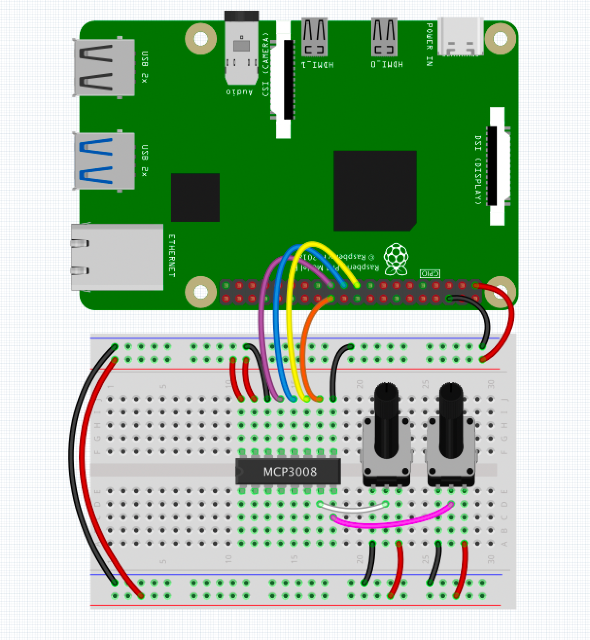 3.3v(red) from the RPi connects to the+Vbus railGND(black) from the RPi connects to the ground bus railVdd(red) from the MCP3008 to the+Vbus railVref(red) from the MCP3008 to the+Vbus railAGND(black) from the MCP3008 to the ground bus railCLK(purple) from the MCP3008 to RPiSPI SCLKDout(blue) from the MCP3008 to RPiSPI MISODin(yellow) from the MCP3008 RPiSPI MOSICS/SHDN(orange) from the MCP3008 to RPiSPI CE0DGND(black) from the MCP3008 to ground bus railCH6(white) from MCP3008 to wiper (centre pin)potACH7(pink) from MCP3008 to wiper (centre pin)potBGND(left pin) fromPotA&PotBto ground bus rail+Vcc(right pin) fromPotA&PotBto+Vbus rail