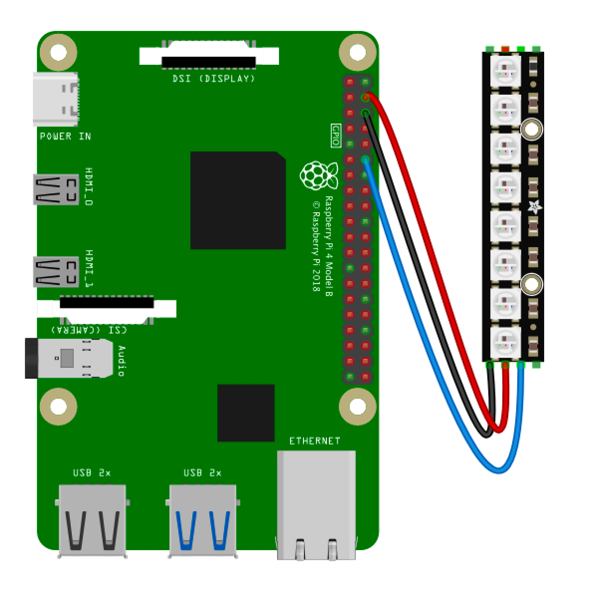 LED strips are usually one of the first things people want to experiment with on a microcontroller - "NeoPixels" (WS2812) are the most common type you'll often see and are really easy to use. In this article we'll learn the basics of using a small NeoPixel strip to respond to the volume of our RNBO patcher on the Raspberry Pi.
